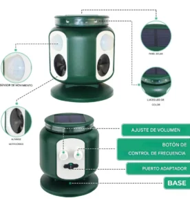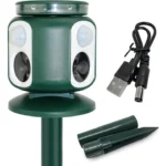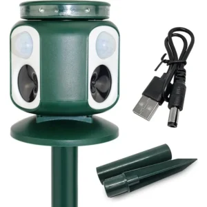 Aplicación versátil: ideal para todos los espacios al aire libre, incluyendo jardines, patios y patios. Este repelente solar de animales es una solución integral para disuadir a mapaches, perros, gatos, murciélagos, pájaros y más. Diseño eficiente y duradero: cerdas con eficacia duradera, nuestro repelente es resistente a la intemperie y satisface la continuidad. Los sensores duales ofrecen una amplia cubierta de área de 220°, que funciona incansablemente incluso bajo nubes o después del anochecer Innovador sistema repelente: este repelente no solo emite luces LED intermitentes, sino que libera un sonido de alta frecuencia que repele a los animales. Es un dispositivo alimentado por energía solar que desvía efectivamente todo de aves molestas a ciervos esquivos. Prácticas opciones de recarga: este repelente solar también cuenta con un cable USB para carga de respaldo. Protege tus espacios de plagas 24/7 sin interrupciones, excelente para jardines, áreas de alimentos y muelles Duradero y duradero: construido con materiales robustos y resistentes a la intemperie, este repelente solar de animales está diseñado para soportar la ira de la naturaleza. Con 5 modos variados, protege fácilmente de zarigüeyas, armadillos y otros intrusos molestos