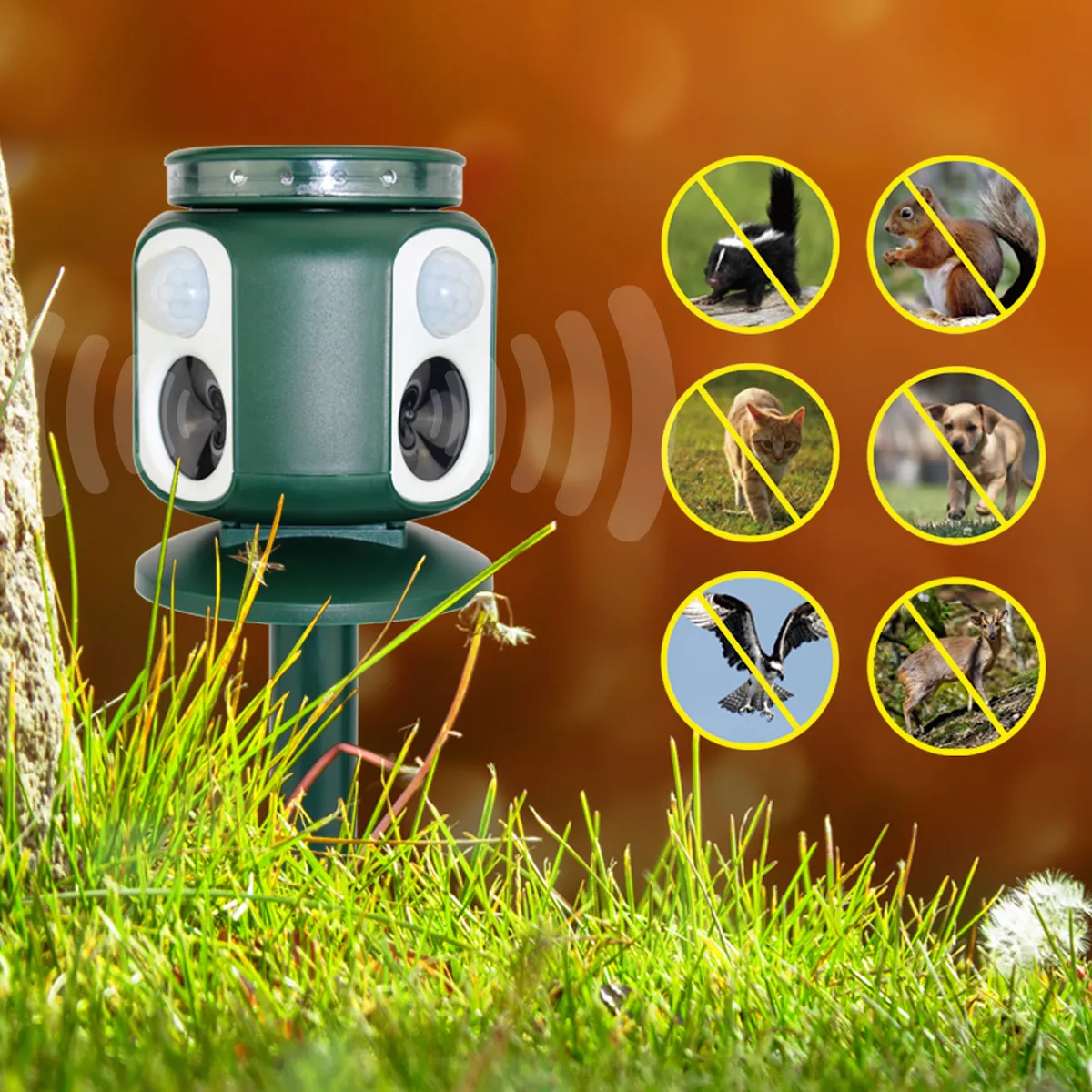 Aplicación versátil: ideal para todos los espacios al aire libre, incluyendo jardines, patios y patios. Este repelente solar de animales es una solución integral para disuadir a mapaches, perros, gatos, murciélagos, pájaros y más. Diseño eficiente y duradero: cerdas con eficacia duradera, nuestro repelente es resistente a la intemperie y satisface la continuidad. Los sensores duales ofrecen una amplia cubierta de área de 220°, que funciona incansablemente incluso bajo nubes o después del anochecer Innovador sistema repelente: este repelente no solo emite luces LED intermitentes, sino que libera un sonido de alta frecuencia que repele a los animales. Es un dispositivo alimentado por energía solar que desvía efectivamente todo de aves molestas a ciervos esquivos. Prácticas opciones de recarga: este repelente solar también cuenta con un cable USB para carga de respaldo. Protege tus espacios de plagas 24/7 sin interrupciones, excelente para jardines, áreas de alimentos y muelles Duradero y duradero: construido con materiales robustos y resistentes a la intemperie, este repelente solar de animales está diseñado para soportar la ira de la naturaleza. Con 5 modos variados, protege fácilmente de zarigüeyas, armadillos y otros intrusos molestos