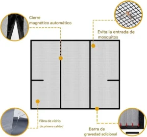 Decile adiós a los insectos y hola al aire fresco La CORTINA magnética PESTGATE está diseñada con fibra de vidrio de alta calidad, un material ultra resistente, transpirable y duradero que supera ampliamente a las tradicionales mallas de poliéster o nailon. Su innovador diseño con cierre automático magnético permite un paso cómodo y sin manos, ideal para hogares con niños y mascotas.
