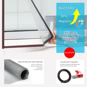 Malla de fibra de vidrio fina: La malla de la pantalla de la ventana está hecha de fibra de vidrio mejorada, que tiene ventajas en retardante de llama, ignífugo, resistencia química y resistencia al desgarro; tira magnética fuertemente unida (fuerza magnética de hasta 720GS), 4 líneas magnéticas mejoradas, duplicando la fuerza de succión magnética.