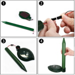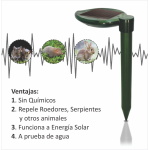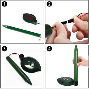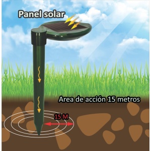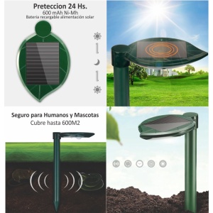El Repelente funciona con una batería cargada solar. El módulo solar carga la batería durante el día y ejecuta la unidad, mientras que la batería permite el funcionamiento nocturno. Elija la mejor situación de sol permitiendo que el panel solar reciba la luz directamente.